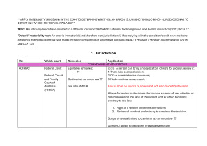 Comperhensive table that lists jurisdiction, remedies, grounds for review and ouster clauses. Super useful to help decipher the nightmare that is ANU's Administrative Law course. Sample document shows the first page of each section. Full document lists the following: 1. Jurisdiction: - ADJR Act - s39B - s39B (1A)(c) - s73 -s75(iii) - s75(v) - Common law and equity 2. Remedies: - Certiorari - Prohibition - Mandamus - Injunctions (Prohibitory and Mandatory) - Declaration - ADJR Act Remedies and Jurisdiction 3. Grounds for review - Procedural Fairness - Statutory Procedural Norms - Norm against improper purpose - No-fettering norm - Norms which require the power must not be exercised under dictation - Unlawful delegation of decision-making authority - Law/Fact distinction - Legal reasonableness norms 4. Accessing Judicial Review - Standing and Legislative Restrictions (Ouster clauses) - Standing - Legislative Restrictions