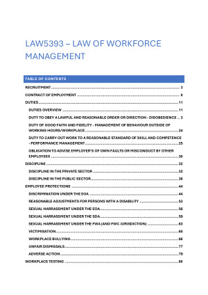 Taken in 2024 Used these notes in the exam to get an overall HD mark for the unit Includes comprehensive case summaries to make it easy to analogise/distinguish in your responses Topics covered: -Recruitment -Contract Of Employment -Duties -Duties Overview -Duty To Obey A Lawful And Reasonable Order Or Direction - Disobedience -Duty Of Good Faith And Fidelity - Management Of Behaviour Outside Of Working Hours/Workplace -Duty To Carry Out Work To A Reasonable Standard Of Skill And Competence - Performance Management -Obligation To Advise Employer’s Of Own Faults Or Misconduct By Other Employees -Discipline -Discipline In The Private Sector -Discipline In The Public Sector -Employee Protections -Discrimination Under The EOA -Reasonable Adjustments For Persons With A Disability -Sexual Harrassment Under The EOA -Sexual Harrassment Under The SDA -Sexual Harrassment Under The Fwa (And Fwc Jurisdiction) -Victimisation -Workplace Bullying -Unfair Dismissals -Adverse Action -Workplace Testing -Workplace Health And Safety -Oh&S Act -Workcover – Wirc Act (Incl. Termination Of Employment) -Fitness To Work / Return To Work -Mental Health -Mental Health And The Oh&S Act -Mental Health And Workers Compensation (Workcover) -Mental Health And FWA -Workplace Investigations -Alternative Dispute Resolution -Abandonment Of Employment