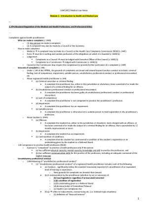 These are my comprehensive in-depth notes I used to study to achieve High Distinctions in both the Mid-Semester and Final Examinations and ultimately place 2nd in the course. Although comprehensive, these notes are CLEAR and CONCISE, making them easy to follow and understand. This is intentional - I believe the most effective notes contain only the necessary information and should not be arduously long. These notes contain all the required readings and materials discussed in class including tips from the lecturer on how to tackle certain legal issues where relevant. They will help you tackle any problem question that comes your way. Topics covered: Module 1: Introduction to health and medical law Module 2: Consent to medical treatment Module 3: Professional liability Module 4: Reproduction Module 5: Withdrawal of treatment, end of life decision-making, and assisted dying I wish you all the best and hope that these notes provide some relief to your studies.