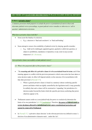 Inclusive of the following topics: - Overview of the Australian administrative law system - Foundational concepts and institutions - Delegated legislation - The concept of administrative justice - Administrative law values - Merits review (AAT and ART) Judicial review: - Scope of judicial review (jurisdiction) - Standing - Right to reasons - The grounds of review (excl. the bias rule, improper purposes, and mandatory/prohibitory considerations) - Jurisdictional error - Remedies - Statutory restrictions