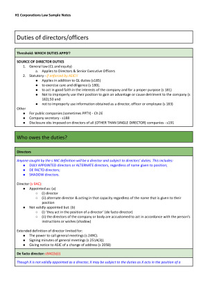 Contents: Incorporation Managing companies - Internal governance - Division of decision-making & meetings - Procedural irregularities Corporate liability - Contractual liability - Other liability Director/officer duties - Who owes the duties? - Which duties? * Act in good faith * Act for proper purpose * Care, skill & diligence * Prevent insolvent trading - Avoid conflict - Avoid profit from position Shareholder actions Share capital