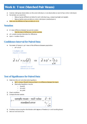 These are my notes from the 2024 course outline that covers all 11 weeks. Table of Contents: Week 1 Definitions, Sampling Methods, Experimental Design Week 2 Descriptive Statistics, Central Tendency, Spread of Distributions Week 3 Linear regression Week 4 Exponential Functions, Power law Functions Week 5 Statistical Inference Week 6 Confidence Intervals Week 7 Significant Testing Week 8 Single mean T-test, Matched pairs T-test Week 9 Two independent Samples Week 10 Population Proportions Week 11 Two Way Contingency table, Chi Squared