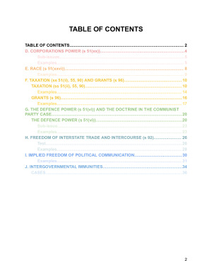 These notes are incredibly comprehensive and once taken into an exam, every issue and sub-issue is covered. This scaffold gave me an HD mark. Topics covered are just for the final exam and does not include the non-assessable topics that were covered in the mid-sem. Topic D: Corporations Topic E: Races Topic F: Taxation and Grants Topic G: Defence Topic H: Freedom of interstate trade and intercourse Topic I: Implied Freedom of Political Communication Topic J: Intergovernmental Immunities