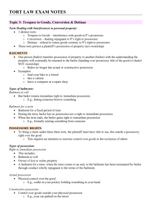 Topics: Topic 3: Trespass to Goods, Conversion & Detinue Topic 4b: Breach & Standard of Care Topic 4c: Causation Topic 4d: Defences & Damages Topic 5: Vicarious Liability & Non-delegable Duties of Care Topic 6: Nuisance