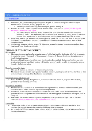 Detailed notes including all relevant case law (pink) and legislative provisions (green) to assist you in preparing for your Intro to IP assessments and take home exam!! Good luck <3 Includes • detailed notes (blue table) on the basic concepts and fundamental principles of Intellectual Property Law in Australia • step by step instructions for the more complex topics such passing off, trade marks and copyright Topic list 1. Introductory concepts 2. Commercial misrepresentation 3. Trade marks 4. Copyright 5. Design Law 6. Patents 7. Breach of Confidence