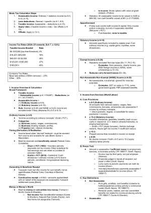 Completed the subject in Sem 1 2025 with Miranda. This six-page summary distills an entire semester of JD Taxation Law and Policy into a succinct, high-yield resource, ideal for law students seeking clarity, structure, and exam-readiness. It is perfect for open-book exams, tutorials, and revision, with each topic formatted to optimise active recall and legal reasoning. Key Features: Comprehensive yet concise: Covers all examinable topics in just 6 pages. Legislation-focused: Pinpoint references to key provisions of the ITAA 1997, ITAA 1936, GST Act, and others. Integrated case law: Leading authorities (, Myer, FCT v Dixon, Steele, Montgomery, Cooling, Westfield, etc.) summarised in 1–2 line takeaways. Policy + black letter law: Includes normative and doctrinal insights for HD responses. Logical structure: Clear headings, sub-points, and issue-rule-application summaries for quick reference. 📚 Topics Covered: Ordinary Income (s 6-5) – business income, windfalls, employment, annuities, and tax characterisation. Statutory Income (s 6-10) – including s 15-2, 15-10, 15-30 and CGT (Parts 3-1 and 3-3). Capital Gains Tax – CGT events, exemptions, and main residence rules. General Deductions (s 8-1) – positive and negative limbs with leading cases. Specific Deduction Rules – including self-education, interest deductibility, and timing issues. Capital vs Revenue – structure/process test, enduring benefit, case comparisons. Fringe Benefits Tax (FBT) – key definitions, exemptions, and valuation rules. Goods and Services Tax (GST) – taxable supplies, input tax credits, and international transactions. Tax Avoidance (Part IVA) – dominant purpose test, scheme identification, and Peabody, Hart, Ramsay principles. Residency and Source – statutory tests and common law rules. Entities – Partnerships, Trusts, and Companies taxation principles. Timing & Accounting – derivation and incurrence, accrual vs cash, prepayment rules.