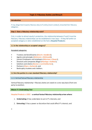 These LAW3111 Equity notes are built to help you smash the exam. Clear, structured, and easy to follow, they walk you through each topic with step-by-step frameworks, key cases, and ready-to-use intro sentences that help to get the ball rolling during the exam. No fluff, just exactly what you need to hit every element with confidence. Covers: Topic 3: Fiduciary Duties and Breach Topic 4: Personal Equitable Remedies Topic 5: Proprietary Equitable Remedies Topic 6: Assignment of Proprietary Rights in Equity Use these notes to write faster, argue clearly, and pick up marks under pressure.
