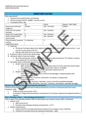 Comprehensive notes that cover all examinable content for the final exam, all set out in a step by step framework with colour coded legislation and cases, and highlighted key phrases. These notes are extremely easy to follow and carried me through the exam, and helped me achieve a HD final exam mark :) Topics included: DIRECTORS DUTIES - Duty of Care - STATUTORY Duty to Avoid Insolvent trading - Duty to Act in Good Faith and for Proper Purpose - Duty to Avoid Conflict REMEDIES & SANCTIONS FOR BREACH - Statutory Sanctions - General Law Sanctions - Members remedies (Fraud on the Minority, Breach of Fiduciary Duty Owed to Member, Statutory Injunction, Oppression, Derivative Action) - Winding Up