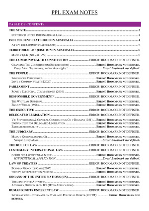 These notes are what I took into the exam which formed the basis of my response to the hypotheticals. I received a mark of 82 for that exam. These notes have been colour coded and organized for your convenience - I have what I wrote exactly in some areas which helped solidify my understanding and saved a lot of time in the exam (you can then reformulate this to your own words). I have also added hypo structures which were incredibly useful for my understanding of how to answer questions. Notably the PPL course structure was reorganized in Sem 1 2024 so it's essential to have updated and well structured set of notes. The PPL exam requires you to link certain topics together throughout the course and I have set out several examples of how I did this (eg. linking treaty interpreation and customary international law, federalism and responsible gov and the judiciary). Topics covered include: -The state and public law -Territory and sovereignty in the Australian context -The acquisition of independence in the Australian context -The Commonwealth Constitution -The people -Parliaments and representative democracy -Responsible government -The Executive -Delegated legislation and extraterritoriality -The judiciary -Federalism -The rule of law -Sources of public international law: customary international law and the law of treaties -The organs of the United Nations -Human rights under international law -The protection of rights in Australia -Treaty-making and implementation in Australia