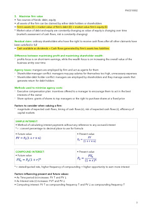 Summary sheet which covers key concepts in simple terms. Includes examples and important formulas. Week 1: Overview, Intro to Financial maths 1 Week 2: Financial maths 2 Week 3: Debt securities Week 4: Equity securities Week 5-6: Portfolio theory and asset pricing Week 8-9: Capital budgeting Week 10-11: Capital structure and payout policy Week 12: Introduction to options