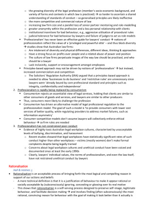 These notes are a one-stop shop! They are comprehensive, detailed and colour coded. They include detailed case summaries, nuances in discussion/analysis and helped me score 81/100. They are all that you need to review the subject, including the prescribed readings (legislation, cases, etc.) Topics covered include: * Introduction * Approaches to legal ethics and professional responsibility * Diversity and the role of lawyers * Legal needs, access to justice and delivery of legal services in Australia * Law practice management Legal Education - Pre and post admission to the profession * Duties to the court and the administration of justice * Duties of representation and the lawyer * Communication and interviewing * Duty of confidentiality and IST prep * Conflicts of interest * Duties in specific areas of practice * Competence, liability and immunity * Complaints and discipline * Technology and the future of legal services, lawyering and the legal profession