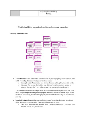 Contains notes on: 1. Land Titles 2. Effects on non-compliance with formalities and equitable intervention 3. Equitable intervention 4. Registration and indefeasibility 5. Indefeasibility exceptions 6. Property disputes 7. Property disputes continued 8. Co-ownership 9. Mortgages 10. Leases 11. Easements 12. Cheat sheet on how to identify issues from facts 13. Statutory rules cheat sheet 14. Cases summaries cheat sheet