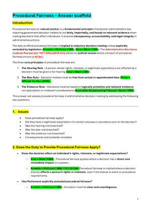 These scaffolds are a great way to hone your study. Work through practice questions using these comprehensive scaffolds. Supplement with your own learnings/logic, or if you need to cram (hey life gets in the way sometimes!). Either way you will be in an excellent position with these notes!! About me: I am an excellent student. I have received 1st Class honours in my original undergraduate, have received awards in my masters and spent 10 years lecturing and tutoring at universities. I know what it takes to get good marks at university!!! Topics covered 1. Introduction to Administrative Law 2. Rulemaking & Subordinate Legislation 3. Refugee Issues 4. Procedural Fairness 5. Merits Reviews & Tribunals 6. Judicial Review 7. Standing and Privative Clauses 8. Reasons for Decisions 9. FOI, Ombudsman & Privacy 10. Ethical Issues 11. Public Inquiry 12. Anti-terrorism