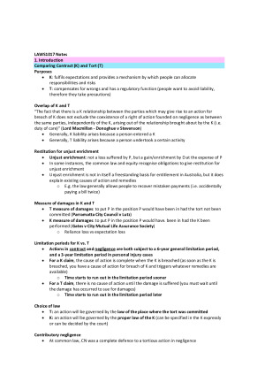 Clean, Organised, Well structured Notes. Topic 1: Trespass to land Topic 2: Private nuisance; statutory liability for damage by aircraft Topic 3: Tort liability for interference with goods. Topic 4: Tort liability for pure economic loss (PEL): intentional torts and negligence. Includes deceit; negligent misstatement; and professional negligence Topic 5: PEL from third party property damage and defective goods Topic 6: Multiple wrongdoers – proportionate liability Topic 7: Introduction to vitiating factors and the remedy of rescission; mistake; undue influence; and duress Topic 8: Unconscionable conduct and unfair contract terms Topic 9: Misrepresentation as a vitiating factor at general law and statutory liability for misleading or deceptive conduct. Topic 10: Causation and remoteness of damage in contract Topic 11: Measure of damages in contract Topic 12: Sums fixed by contract, including the law relating to penalties