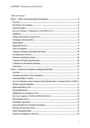 Description Comprehensive HD-level study guide for Company Law (LAWS4012/LAWS4005) covering Weeks 1–12. Includes clear, structured bullet-point summaries, AGLC4-style case and statute references, and concise explanations ideal for open-book exams. Topics covered: • Corporate personality, constitution, and replaceable rules • Company contracts, promoters, and pre-registration liability • Directors’ duties (ss 180–184, 180(2) business judgment rule) • Conflicts and related-party transactions (Part , ss 191–195) • Members’ rights and remedies (ss 232–233, 236–242) • Corporate governance and shareholder meetings • Fundraising and disclosure (Ch 6D) • Takeovers (Ch 6, ss 602, 606, 611, 657A, 657D) • Insolvent trading, safe harbour, and creditor-defeating dispositions (ss 588G, 588GA, 588FDB) • External administration (ss 435A–444D, s 556) • ASIC enforcement and remedies (ss 1317E–1317H, s 206F, ASIC Act ss 1(2), 11, 19, 28, 30, 93AA, 102) • Essay Policy Themes (fairness, accountability, efficiency, investor protection) • Exam Toolkit and Legislation Reference Guide Features: – 55+ pages of detailed, plain-language notes – Structured for fast navigation and open-book use – Fully exam-aligned to Tim Connor’s 2025 Company Law course – Includes case principles, IRAC breakdowns, and policy links