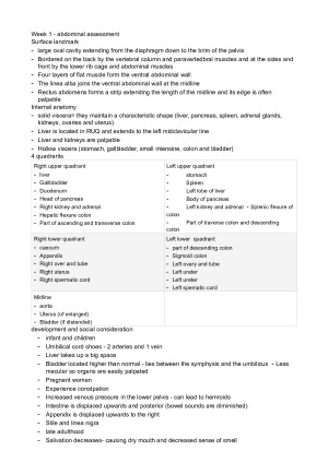 HNN114: Health Assessment: Week 1 - abdominal assessment Week 2 - respiratory assessment Week 3 - cardiovascular system Week 4 Week 5- musculoskeletal and neurological assessment Week 6- nutrition Week 7 - the secondary assessment Week 8 - The general survey and mental health assessment Week 9 - health screening