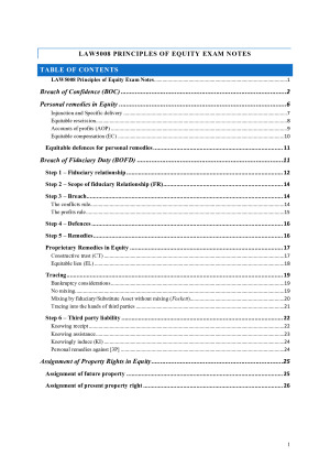Breach of Confidence (BOC) Personal remedies in Equity Injunction and Specific delivery Equitable rescission Accounts of profits (AOP) Equitable compensation (EC) Equitable defences for personal remedies Breach of Fiduciary Duty (BOFD) Step 1 – Fiduciary relationship Step 2 – Scope of fiduciary Relationship (FR) . Step 3 – Breach The conflicts rule The profits rule Step 4 – Defences Step 5 – Remedies Proprietary Remedies in Equity Constructive trust (CT) Equitable lien (EL) Tracing Bankruptcy considerations No mixing Mixing by fiduciary/Substitute Asset without mixing (Foskett) Tracing into the hands of third parties Step 6 – Third party liability Knowing receipt Knowing assistance Knowingly induce (KI) Personal remedies against [3P] Assignment of Property Rights in Equity