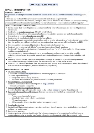Full notes for LAW2101, including in-class notes from workshops and tutorials + case summaries + full exam script for all examinable topics HD (82) overall mark TABLE OF CONTENTS I. TOPIC NOTES 1. Introduction 2. Offer 3. Acceptance 4. International Contract Law 5. Consideration 6. Intention 7. Certainty 8. Capacity 9. Formalities 10. Privity 11. Estoppel 12. Express terms - Incorporation 13. Express terms - Interpretation 14 + 15. Implied terms - Good Faith 16 + 17. Australian Consumer Law II. CASE SUMMARIES (pages 60-128) III. EXAM SCRIPT (pages 130-174)