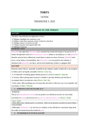 Complete Exam Script Notes for Torts used to get an overall subject mark of 85. Completed in Trimester 3, 2025. Topics include: - Trespass to the person - Land Torts - Defences and Remedies for Intentional Torts - Negligence (including defences, damages and vicarious liability)