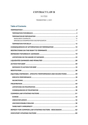 Contract Law B notes with exam scripts. Completed in Trimester 3, 2025. Topics Include: - Termination - Restrictions on Termination - Damages - Liquidated Damages and Penalties - Action for Debt - Restitution - Specific Performance and Injunctions - Frustration - Common Law Vitiating Factors (Duress, Undue Influence, Unconscionable Dealing, Third Party Impropriety) - Remedy for Common Law Vitiating Factors - Statutory Vitiating Factors - Remedies for Statutory Vitiating Factors