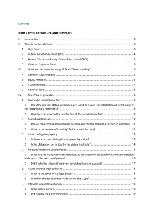 The template has been carefully curated to a logical structure to help with hypothetical exam. It also uses 2025 exam legislation as an example to show how to apply rules/case law to exam. PART I. HYPO STRUCTURE AND TEMPLATE I. Introduction II. What is the jurisdiction? A. High Court B. Federal Court of Australia (FCA) C. Federal Circuit and Family Court of Australia (FCFCA) D. Victorian Supreme Court III. What are the remedies sought? Does Y have standing? A. Common Law remedies B. Equity remedies C. ADJR remedies D. Victorian level IV. Does Y have grounds? A. Error as to jurisdictional fact 1 Does the relevant statue prescribe a pre-condition upon the satisfaction of which enlivens the discretionary power of X? 2 Was there an error to the satisfaction of the jurisdictional fact? B. Procedural fairness 1 Does a requirement of procedural fairness apply to the decision or action in question? 2 What is the content of the duty? Did X breach the duty? 11 C. Invalid delegation/agency 1 Is there an express delegation of power by statue? 2 Is the delegation permitted by the statue impliedly? D. Relevant/irrelevant consideration 1 What are the mandatory considerations to be taken into account?/Was the consideration irrelevant to the exercise of power? 2 Did X take the relevant/irrelevant consideration into account? E. Acting without legal authority 1 What is the scope of X’s legal power? 2 Whether the decision was made within the scope? F. Inflexible application of policy 1 Is the policy lawful? 2 Did Y apply the policy inflexibly? G. Unreasonableness 1 The standard of reasonableness attached to the statutory power? H. Delegated legislation – improper purpose 1 What is the meaning of the words used in the enabling Act permitting delegated legislation? 2 What is the meaning of the delegated legislation? 3 Does the delegated legislation fall within the power of the enabling Act? V. What is the consequence of breach? A. Breach of an express or implied condition? Was the breach material? VI. Would the privative clause limit the remedies available? A. ‘Finality’ clause B. ‘Limitation’ device C. ‘No invalidity’ clause VII. Conclusion PART II. ESSAY TOPIC AND RESOURCES I. The role of the Charter of Human Rights and Responsibilities II. The distinction between merits & judicial review III. ADJR Act vs Common Law IV. Migrants and Aboriginals PART III. SUMMARY TABLE OF EXAM LEGISLATION