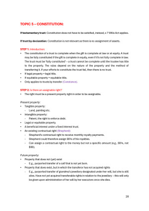 HD TRUSTS EXAM NOTES These trusts notes provide a clear, step-by-step framework for answering problem questions, setting out exactly how to approach each issue in a structured way. They include detailed explanations of key principles, and also incorporate case analogies and guidance on how to distinguish authorities to ensure HD answer quality. In addition to answer frameworks, the notes explain concepts to students so that they know when / why they are applying certain principles. Topics: - concept of a trust and certainty of intention - certainty of subject matter, trust structures, trusts and powers - certainty of object - quistclose trust - charitable trusts - formalities - constituting a trust - duties and powers of trustees - defences and limitations on liabilities - trustee rights and beneficiary rights - remedies