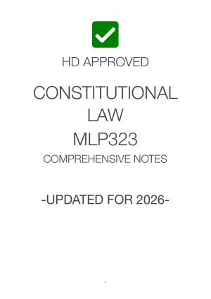 Master Australian Constitutionalism with the exact notes I used to score an HD. These notes are professionally structured for high-pressure online quizzes, assignments, and exams, providing the clarity you need to succeed in MLP323. These notes cover: 1 | AN INTRODUCTION TO AUSTRALIAN CONSTITUTIONALISM - AUSTRALIAN CONSTITUTIONALISM - SOURCES OF AUSTRALIAN CONSTITUTIONAL LAW - HISTORY - COLONIAL PERIOD - FOUR FETTERS - HISTORY - COLONIAL PERIOD: TOWARDS FEDERATION 1880s & 1890s - HISTORY - FEDERATION 1901 - Chapter VIII - Alteration of the Constitution: s 128 - EVALUATION OF CONSTITUTION - CONSTITUTIONAL INTERPRETATION - HISTORY - FEDERATION 1901 TO 1986 - Balfour Declaration 1926 - Statute of Westminster 1931 (UK) - HISTORY - 1986 TO TODAY - Australia Act 1986 (Cth) - POST FEDERATION - Australian law currently - FUNDAMENTAL PRINCIPLES - State vs Cth powers - PARLIAMENTARY SOVEREIGNTY - RULE OF LAW - CONSTITUTIONAL CONVENTIONS - RESPONSIBLE GOVERNMENT - MINISTERIAL RESPONSIBILITY - Individual responsibility - Collective responsibility - PARLIAMENTARY CONTROL OVER SUPPLY - SEPARATION OF POWER - Overlap between powers - Reasons for the separation of legislative, executive and judicial power - FEDERALISM - Balance of power - 1) Specific/enumerated powers - 2) Exclusive powers - 3) Concurrent powers - 4) Residual powers - Federation movement - Reasons for Commonwealth dominance? - Engineers’ Case (1920) 28 CLR at 145 - JUDICIAL REVIEW 3 | THE LEGISLATURE (PARLIAMENT) - COLONIAL HISTORY - STRUCTURE OF COMMONWEALTH LEGISLATURE - SENATE: s 7 / s 122 - HOUSE OF REPRESENTATIVES: s 24 - Western Australia v Cth (Territorial Senators’ Case (No 1)) (1975) - Second Territorial Senators’ Case (No. 2) (1977) - STRUCTURE OF VICTORIAN LEGISLATURE - Constitution Act 1975 (Vic) - STRUCTURE OF TERRITORIAL LEGISLATURE - DURATION - INTRODUCTION & TERMINOLOGY - Traditional model - DURATION - VICTORIAN PARLIAMENT - Adjourned/ Prorogation - DURATION - COMMONWEALTH PARLIAMENT - QUALIFICATIONS FOR MEMBERSHIP: Cth Parliament - DISQUALIFICATION (Cth): s 44 - Sykes v Cleary (1992) (bi-election when seat becomes vacant by death or resign) - Reasonable steps test - ‘foreign power’: s 44(i) - Sue v Hill (1999) - QUALIFICATIONS FOR MEMBERSHIP: Victorian Parliament - CTH ELECTORAL & VOTING SYSTEMS - HOUSE OF REPRESENTATIVES: s 24, 29 - Voting equality - McKinlay (1975) 4 | LEGISLATIVE PROCEDURES - OVERVIEW - 1) STANDARD LEGISLATIVE PROCEDURES (Cth and State) - 2) ROYAL ASSENT - Withholding assent: s 58 - 3) CTH ALTERNATIVE LEGISLATIVE PROCEDURES: s 57 - Cormack v Cope (1974) (occurrence of double dissolution) - ‘PMA Case’ (HCA, 1975) - Effect of High Court’s jurisprudence - Territory Senators’ (No 1) (1975) - 4) CTH RESTRICTIVE PROCEDURES: s 128 - 5) CTH SPECIAL PROCEDURES: ss 53, 54, 55 - Importance of money to governments - SENATE - Money bills - Section 53 - VIC UPPER HOUSE - Money bills / blocking appropriation bills - ANTI-TACKING - Section 55 - Air Caledonie v Commonwealth (High Court, 1988) (case looked at legislation which amended a Principal Act) - Permanent Trustee Australia Ltd v Commissioner for State Revenue (2004) - Air Caledonie - State Chamber of Commerce and Industry v Commonwealth (1987) [] - Mutual Pools & Staff v Commissioner of Taxation (1987) - 6) VICTORIAN ALTERNATIVE LEGISLATIVE PROCEDURES - 7) STATE RESTRICTIVE LEGISLATIVE PROCEDURES - Sovereign Parliament ( UK) - Colonial / State Parliaments - State restrictive legislative procedures - Australia Act 1986 (Cth) - Basal position (s 2) - Section 6 exception - Westlakes ( Supreme Court, 1980) - Attorney-General (WA) v Marquet (HCA, 2003) (laws changing electoral districts is effecting constitution of parliament) - Constitution Act 1975 (Vic) - Constitution Act 1975 (Vic): s 85 re Supreme Court - 8) VICTORIAN SPECIAL PROCEDURES - ‘Appropriation bills’ - ‘Annual appropriation bill’ - WHITLAM DISMISSAL (1975) - Whitlam dismissal: Senate’s Deferral of Supply 1975 5 | THE JUDICIARY - THE JUDICIARY: COMMONWEALTH: Ch III - The High Court - Constitutional ‘Assumption’ of rule of law: s 75 - THE JUDICIARY: VICTORIA - Fundamental principle that are not entrenched provisions - Judiciary Act 1903 (Cth) 6 | CHARACTERISATION - INTRODUCTION - CHARACTERISATION - () - First doctrine: Doctrine of implied immunities - Second doctrine: Doctrine of implied prohibitions / ‘Reserve powers’ doctrine - ENGINEERS’ CASE (1920) - CHARACTERISATION: (1920-Present) - Test: Characterisation - 5 PRINCIPLES OF CHARACTERISATION: Grain Pool of Western Australia v Commonwealth - Heads of power - Dual Characterisation - INCIDENTAL POWERS/RANGE - PURPOSIVE & NON-PURPOSIVE HEADS OF POWER & RELEVANCE OF PURPOSE - Murphyores - Fairfax (1965) (about tax) - HEADS OF POWER & RELEVANCE OF PROPORTIONALITY - Proportionality test - Thomas v Mowbray (2007) 2 | THE EXECUTIVE - THE EXECUTIVE - Commonwealth Executive power: s 61 - Scope of s 61 - Executive: ’Constitutional monarchy’ - Executive: ’The Crown’ - GENERIC FEATURES OF AUSTRALIAN EXECUTIVES - The legal institutions of the Executive - Composition of the Executive - Executive council - Ministers (incl PM) - Government departments & Public servants - The Senate - The first minister - The opposition - Cabinet - CONSTITUTIONAL CONVENTIONS - CONVENTIONS: Responsible government - Institutions of responsible government - SOURCES OF EXECUTIVE POWER - RESERVE POWERS - 1) Appoint and dismiss the Chief Minister - 2) To dismiss PM / dissolve Parliament; and - 3) To refuse to dissolve parliament - 4) To dissolve both houses / force dissolution of Parliament - 5) To dismiss Government acting illegally - 6) Powers re Australia’s Head of State - PREROGATIVE POWERS - Barton v Cth (1982) - Tampa Case - Ruddock v Vardarlis (2001) - Whitlam Dismissal (1975) - IMPLIED NATIONHOOD POWER - AAP Case (1975) (modern expression of the nationhood power) - Queen & Sharkey - Davis v Cth (1988) - Proportionality test (Davis) - P