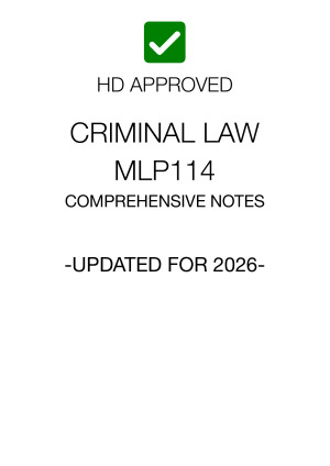 I scored an 86 HD in Criminal Law by using these streamlined, high-impact notes. Criminal Law can sink your WAM if you aren't prepared to find the right sections instantly-these notes are designed for maximum speed and easy marks during the exam. These notes cover: Capacity - Capacity - mental capability required to be culpable for an offence - Companies/ Corporations: - Unlawful Homicide - Actus Reus elements for Murder/ Manslaughter - Voluntary act - Actual Death of the Victim - Causation - Factual causation - Legal causation - Mens Rea Elements for Murder - Intentional Murder - intending to kill someone or cause really serious injury - Reckless Murder - knowing the probable outcome was death or really serious injury - Constructive Murder - Mens Rea Elements for Involuntary Manslaughter - Unlawful and Dangerous Act Involuntary Manslaughter (UDA IM) - Criminally Negligent Manslaughter - Assault - unlawful application of force or threat against a person without consent - Common Law Assault - Statutory Assaults - Intentionally Causing Serious Injury - s 16 Crimes Act - Recklessly Causing Serious Injury - s 17 Crimes Act - Intentionally or Recklessly Causing Injury - s 18 Crimes Act - Negligently Causing Serious Injury - s 24 Crimes Act - Emergency Services Assaults - s 31 Crimes Act - Assault with Intent to Commit Sexual Offence - s 42 Crimes Act - Conduct Endangering Life - s 22 Crimes Act - Defences: Consent to Statutory Assaults - Sexual Offences - Rape - s 38 Crimes Act - Compelled Rape - s 39 Crimes Act - Sexual Assault - s 40 Crimes Act - Compelled Sexual Assault - s 41 Crimes Act - Exceptions to Sexual Offences - Offences Against Property - Theft - criminalised under s 74(1) CA, defined under s 72 CA - Obtaining Property By Deception - s 81 Crimes Act - Obtaining Financial Advantage By Deception - s 82 Crimes Act - Robbery (THEFT + ASSAULT) - s 75(1) Crimes Act - Armed Robbery - s 75A(1) Crimes Act - Burglary - s 76(1) Crimes Act - Aggravated Burglary - s 77(1) Crimes Act - Strict and Absolute Liability Offences - Inchoate Offences - Attempt - s 321M Crimes Act - Incitement - s 321G Crimes Act - Defences to Attempt and Incitement: Legal Impossibility - Conspiracy - s 321 Crimes Act - Complicity - extension of criminal activity for those acting together in crime - s 324 Crimes Act - Defences - Self Defence - complete defence for crimes against the person - s 322K Crimes Act - Mental Impairment - s 20--22 Crimes (Mental Impairment and Unfitness to be Tried) Act 1997 - Intoxication - s 322T Crimes Act; R v O’Connor - Automatism - acts committed by the accused without volition - R v Falconer - Duress - act committed by accused due to threat of force - s 322O Crimes Act - Sudden or extraordinary emergency - s 322R Crimes Act