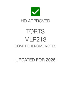 Secure your HD in Torts with the exact notes I used to score 87%. These notes provide an elite-level deep dive into Negligence and are meticulously updated for 2026 to help you navigate exam problems with speed and authority. These notes cover: 1 | INTRODUCTION, DAMAGES & COMPENSATION SCHEMES - OVERVIEW OF THE NATURE OF TORTS LAW - Objectives - Tort reform post-2002 - DAMAGES FOR PERSONAL INJURY - 1) COMPENSATORY DAMAGES - Damages (for living plaintiffs) - Fundamental principles of compensatory damages awards - Objectives of compensatory damages - Terminology - TYPES/HEADS OF COMPENSATORY DAMAGES - A) ECONOMIC LOSS - MEDICAL AND HOSPITAL EXPENSES - 1) Actual medical, hospital, rehabilitation expenses - 2) Damages for gratuitous attendant care services - Loss of ability to care for others - LOSS OF EARNING CAPACITY - Calculating LOEC - Adjustments/discounts - B) NON-ECONOMIC LOSS 12 - What is a significant injury? s 28LF - ‘Significant’ v not-significant injuries - Assessment of impairment ‘objective’ - LOSS OF AMENITIES/ENJOYMENT OF LIFE - Pain and suffering - Loss of expectation of life - AGGRAVATED AND 2) EXEMPLARY DAMAGES - Claims upon the death of a person - 1) Dependants’ claim - 2) Survival of causes of action claim - VICARIOUS LIABILITY - Vicarious liability (VL) of an employer - Two pre-requisites to VL - 1) Indicia of a relationship of employer and employee - 2) In the course of employment or reasonably incidental thereto - Vicarious liability (VL) for exemplary damages 5 | NEGLIGENCE: DUTY OF CARE - INTRODUCTION - Recognisable damage - Aims of negligence? - ELEMENTS OF NEGLIGENCE - Legislative reform - 1. DUTY OF CARE - Historical overview of duty of care - Modern requirements of a duty of care - 1) Factual duty question: ‘Reasonable foreseeability’ - 2) Legal or ‘notional’ duty question - Demise of ‘proximity’ and rise of an incremental and multi-factorial salient features approach - What are the salient features / control factors? - The scope of duty of care and issues of personal responsibility - Policy considerations: Immunity from liability - SPECIAL KINDS OF DUTIES AND LIABILITIES - ‘Wrongful birth’ claims - ‘Wrongful life’ claims - Liability of landlords to occupants - Occupier’s liability to entrants - Duty of parents to children and the rights of the unborn child 6 | NEGLIGENCE: BREACH OF DUTY OF CARE - RECAP: ELEMENTS OF NEGLIGENCE - 2. BREACH OF DUTY - FUNDAMENTAL PROPOSITIONS - STATUTORY PROVISIONS AFFECTING DETERMINATION OF BREACH - Section 48(1) Wrongs Act: General Principles - Section 48(2) ‘Calculus of negligence’ - a) Probability of harm occurring - b) Likely seriousness of the harm - c) Burden of taking precautions - Section 49 Wrongs Act - Section 14J: Apology - d) Social utility - Time for assessing the risk - Intoxication / illegality - Other factors relevant to whether D fell below standard of care - Specific breach situations: Failure to warn - Specific breach situations: Public authorities and recreational activities - Statutory provisions applying to public authorities - STANDARD OF CARE - Standard of the reasonable person - Modification of the standard of care - Children - Parental liability - Special skills - Unconsciousness or automatism - SPECIFIC STANDARDS - Industry standards - Professional standards - Medical professionals - Section 59 Wrongs Act - Failure to warn/provide advice - Professional standards - other professionals 7 | NEGLIGENCE: CAUSATION AND LIABILITY OF MULTIPLE TORTFEASORS - RECAP: ELEMENTS OF NEGLIGENCE - 3. CAUSATION - Section 51 Wrongs Act: Factual and Legal causation - ‘But for’ test - Wrongful diagnosis or treatment: Hotson v East Berkshire Area Health Authority [UK, 1987] - ‘Loss of chance’: Tabet v Gett [HCA, 2010] - ‘Exceptional’ cases: s 51(2) - Novus Actus Interveniens - Test for novus actus - Intervening negligent act of TP - Medical negligence and NAI - Intervening deliberate act of TP - Intervening negligent acts of P - Intervening deliberate acts of P - Multiple successive events - Factual causation: Failure to warn of a medical risk - Test for factual causation - Res Ispa Loquitur - Liability of multiple tortfeasors - Wrongs Act provisions re PL and CL 8 | NEGLIGENCE: REMOTENESS OF DAMAGE - GENERAL PRINCIPLES - General principles from Wagon Mound cases - Manner of occurrence of harm - Extent of harm suffered - ‘Egg shell skull’ rule - Summary 9 | SPECIAL DUTY SITUATIONS: OMISSIONS & PURE MENTAL HARM - PART 1: OMISSIONS - Definition of an ‘omission’ - Examples of failures to act that are not omissions - Exceptional cases where a duty to take affirmative action is required - Duty of care to act to prevent harm to P from criminal activities of third persons? - Exceptional situations - Duty to act to prevent P harming self? - Liability of publicans to drunken patrols - Liability of public authorities for omissions - ELEMENTS: Summary of ‘control factors’ - Policy vs operational decisions - Liability of Highway Authorities - ‘Highway rule’ - Footpaths - PART 2: LIABILITY FOR PURE MENTAL HARM - Part XI of Wrongs Act - Recovery for ‘pure’ mental harm - Common law background - Codification of law on recovery for mental harm - Important factors - Claims arising from the death or injury of another person: s 73 - Bystanders - Cases not falling within s 73 - Consequential mental harm 10 | NEGLIGENCE: DEFENCES TO NEGLIGENCE - 1. CONTRIBUTORY NEGLIGENCE - Test: 3 issues - Issue 1) Negligence by P - Reasonable foreseeability - Standard of care - Issue 1) Causation - Issue 2) Appointment - 100% reduction - Employment - 2. VOLUNTARY ASSUMPTION OF RISK - Actual and subjective knowledge of risk - ‘Obvious risk’: s 53 & 54 - 3. EXCLUSION OF LIABILITY CLAUSES/NOTICES - ACL provisions limit exclusion of liability - ‘Recreational Service Providers’ in ACL - Test: will exclusion/limitation of liability apply? - 4. LIMITATION OF ACTIONS 11 | PRIVATE NUISANCE - ELEMEN