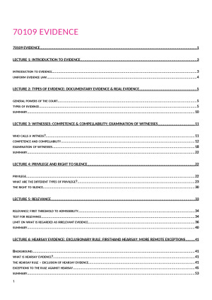Comprehensive and colour-coded scaffolds/answers to each type of problem question in Evidence. - Includes all necessary authorities - Answers are all clearly structured - Achieved a High Distinction in the exam and mark of 88 overall with these scaffolds Topics: - Burdens and Standards of Proof - Judicial Notice - Evidence Act Admissibility - Documentary Evidence and Real Evidence - Witness Evidence: Competence, Compellability and Swearing in - Witness Examination: examination in chief, cross examination, re examination, failure to call witnesses and evidence of silence - Relevance - Hearsay Rule - Credibility Rule - Character Evidence - Opinion Rule - Tendency Evidence - Coincidence Evidence - Discretionary/ Mandatory Rules - Warnings and Discretions - Privilege: Client Legal Privilege and Professional Legal Privilege
