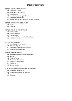 Highly detailed and structured final exam notes containing all assessable topics, relevant case law and statute where applicable. Topic Included; -Contract Formation ( certainty completeness and Illusory contracts, formalities) -Parties (privity) -Terms of the Contract (express terms, parol evidence rule, collateral contracts incorporation of terms by signature, notice, and course of dealings) -Construing Terms (extrinsic evidence and the parol evidence rule, construction, exclusions clauses) -Implied Terms (implied in fact and by custom) -Discharge/Termination of a Contract (discharge by performance, frustration, termination by performance, agreement, breach, repudiation) -Vitiating factors (Proper consent) (misrepresentation, ACL s18, mistake, duress, undue influence, unconscionable conduct, third party impropriety, illegality) -Introduction to Remedies (rescission, election, actions for debt, damages)