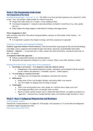 SCLG1002 notes are clear, well-structured, and simple, covering all SCLG1002 learning outcomes from the sociological imagination right through to demography. Key theories and thinkers ( Foucault, Marx, Durkheim) are explained simply and clearly, making complex sociological ideas easier to understand and apply. The notes are organised topic-by-topic - they helped me stay organised, save time, and understand what I was learning. Topics are: Week 1: The Organisation of the Social Week 2: Race 1: Indigenous Dispossession and Resistance Week 3: Race 2: Ethnicity and Multiculturalism Week 4: Health 1 | Healthy bodies and populations Week 5: Health 2 | Embodying unequal health Week 6: Gender and Sexuality | Gender Division and Diversity Week 7: Gender and Sexuality 2 Week 8: Law as a Social Institution Week 9: Refugee Regime Week 10: Social Justice & Social Policy Week 11: Redistribution & Social Policy WEEK 12: Introduction to demography 1 WEEK 13: What is Formal Demography?