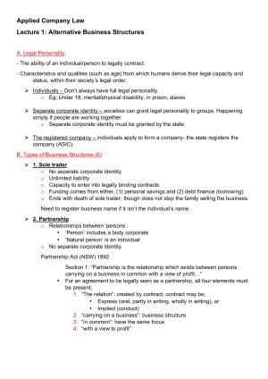 These notes cover the entire applied company law subject in great detail. They include summary notes from each lecture as well as both textbooks. NOTE: detailed case summaries are not provided for each case covered in the course.