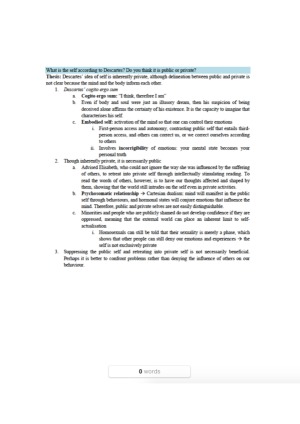 Final mark was HD. Contains: - Four concisely answered questions on knowledge (Hume's problem of induction; Bayes' theorem; Bayes' theorem applied to Hume's miracles; Kant and necessary conditions of experience) - Four concisely answered questions on self (Aristotle and friendship; shame as moral emotion; Descartes' public/private self; Locke's thought experiments) - DISCLAIMER: The questions I answered are not guaranteed to be on your exam. Use them as a guide as to how one should approach a philosophical question!