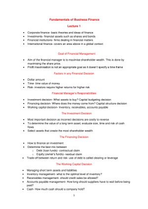 Thorough finance notes which allowed me to achieve a HD in this subject. I found them especially useful in my preparation for the 25300 quizzes, assignment and final exam. Some of the concepts explained include: - Goals of Financial Management - Time Value of Money - Debt and Valuation - Equity and Valuation - Capital Budgeting - Risk and Return - The Cost of Capital - Capital Structure