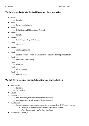 Detailed yet concise PHIL2642 notes on every week of this course including sample exam questions and answers as well as other anecdotes and information covering all aspects of the course.