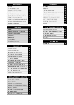 These offence tables are essential for the problem question aspect of the Criminal Laws exam. Presented in a clear, precise and modern format - they are easy to navigate using the contents page and quick reference page numbers. Each section summarises the particular offence, taking you through the applicable tests (i.e. acts refs, mens read etc) stage by stage in a way that will allow you to quickly answer the problem questions - including other information that will score you bonus points such as sentencing etc.