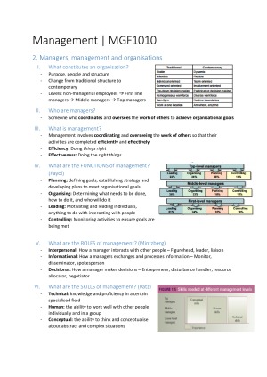 Comprehensive, detailed notes on introduction to management (MGF1010) from semester one, 2016. Covers weeks 2-11 as they have all the content, and includes examples drawn from the lecture slides. Mark attained is average mark from in-semester work.