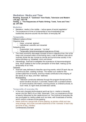These are comprehensive, current notes which have collated the following: - Key information from lecture slides - Key information and points the Lecturer has given - Other students notes - Notes taken from the designated readings - Tutorial notes and information the Tutor has given They also include contemporary examples relevant to course topics, which are vital in assisingt answers in the exam. The notes are structured by key headings based off topics learnt throughout the semester, which are connected to the Media Practitioners learnt about in the course.