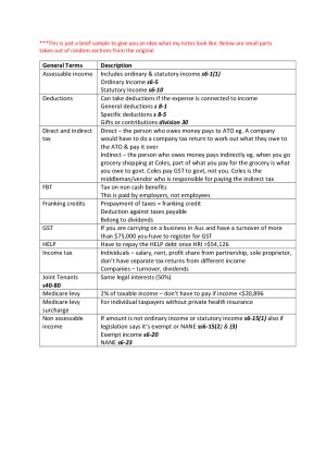 Complete course notes gathered from lectures, tutorials, study notes, textbook and other course readings Includes definitions, cases, section numbers in legislation and calculations in alphabetical order as recommended by the lecturer to easily find what you're looking for in exams