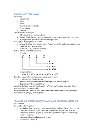 EDUC258 from a high achieving student. The notes are presented in an easy to read format with dot-points used for all notes, clearly organised under headings and sub-headings. These notes cover all topics covered during the semester including: - Development of maths concepts - Nature of maths learning - Maths and technology - Counting strategies - Theories of teaching mathematics prompting meaningful early literacy - Developing number sense - Teaching and learning addition and subtraction concepts and processes - Multiplicative reasoning - Teaching and learning multiplication and division concepts and processes - Learning about rational numbers - Teaching and learning fractions - Learning about patterns and algebra - Pattern and structure in mathematic learning - Pattern finding - Learning about measurement - Approaches to teaching and learning measurement - Development of spatial and geometric understanding - Tessellation - Working mathematically - Development off statistical reasoning and data exploration - Chance and probability