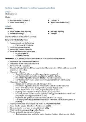 Comprehensive notes which have been taken and complement the lectures for the PSYCHOL3022 course. I did use a textbook for this course, however the lecturers have noted that some sections of the text are incorrect (chapter 13 apparently) and they have chosen not to use it as a required reading. However, if you still want to do the readings, the textbook chapters are 10 - 16 and half of chapter 25. Textbook: Personality, Individual Differences and Intelligence by Maltby, Day & Macaskill