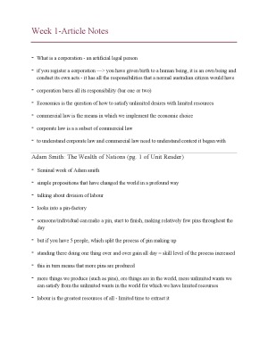 Week to Week Notes for LAW456 Business Organisations, pretty useful considering the unit only does on site lectures with no powerpoint/ECHO recordings are audio only, as the lecturer believes thats 'the best way to learn'.