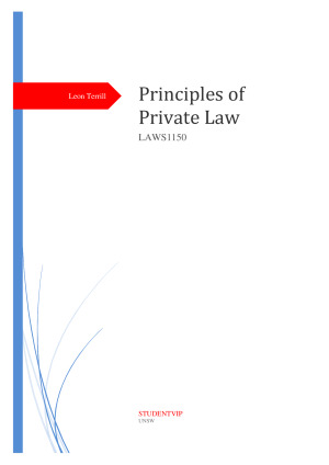 Contained is the most comprehensive set of LAWS1150 Private Law Notes you will foreseeably behold. 282 pages and 102,320 words of high distinction goodness. It is divided into a class participation section and a more concise exam-friendly print off version. Section 1 contains all the notes for the course content, including answers to the questions from the reading guide. It has comprehensive facts, judgments and reasoning, as well as the key ratio for the case at the top of the case and why it is significant. These have been annotated from the course convenor’s comments. I have also included a concise take in exam version that has examples of what you need to write for each problem question, including each element to be proven. I would recommend printing them 2 pages to a side on paper to bring into the exam after getting to know the notes a bit. There are also final exam essay plans and an answer to essay questions. With these notes, I’d be pretty surprised if you didn't get HD. Check out the sample!