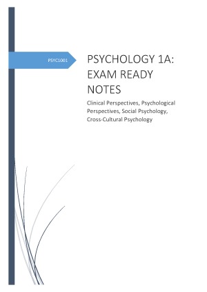 All you need to know for the PSYC1001: Psychology 1A Clinical perspectives, Psychological Perspectives, Social Psychology and Cross-Cultural Psychology sections of the course. Summary of Lecture and Textbook information accompanied by diagrams for clear understanding, of which i created and used to achieve a HD in PSYC1001. Don't waste time writing notes!