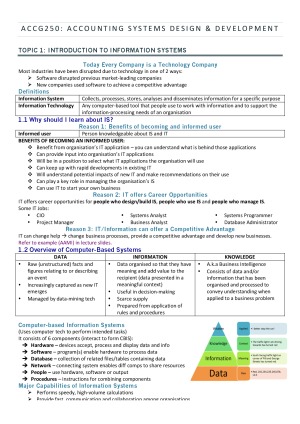 Comprehensive summaries of each topic, including diagrams and examples from both the textbook and lectures, Contains: Topic 1: Introduction To Information Systems Topic 2: Organisational Strategy, Competitive Advantage & Is Topic 3: Information Systems Within The Organisation Topic 4: Introduction To Internal Controls Topic 5: Revenue Cycle Topic 6: Expenditure Cycle Topic 7: Hr Management & Payroll Cycle Topic 9: Acquiring Information Systems And Applications Topic 10: General Ledger & Financial Reporting Cycle Topic 11: Ethics And Privacy Topic 12: Cloud Computing And Ais