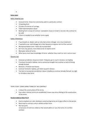 Document contains all the essential topics of Contract Law I: 1) Agreement-offer and acceptance 2) Consideration 3) Intention to Create Legal Relations and Certainty 4) Formalities and Capacity 5) Estoppel 6) Privity of Contract 7) Express Terms 10) Construction of Terms and Extrinsic Evidence 11) Implied Terms and Duty of Good Faith 12) Frustration