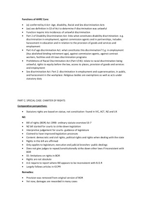 These notes contain the essential topics covered in the unit, both for LAW326 and LLM526: PART A: Topic (i) Nature of rights Topic (ii) UN Charter based institutions Topic (iii) ICCPR and First and Second Protocols Topic (iv) ICECSR and Optional Protocol Topic (v) CAT, CERD Topic (vi) Genocide Convention PART B: Topic (vii) Overview of Aus Human Rights and CTH Human Rights Legislation PART C: Topic (viii) Charters of Rights