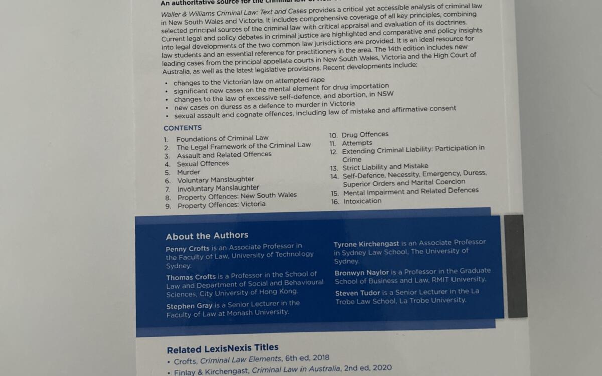 WALLER & WILLIAMS CRIMINAL LAW TEXT AND CASES, 14TH EDITION.